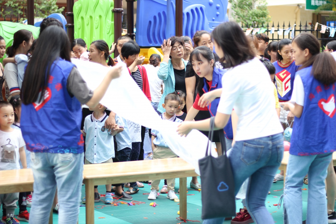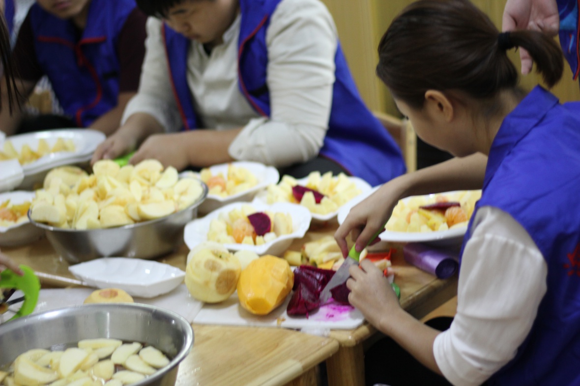 在到达幼儿园后,同学们在青协同学带领下开展志愿活动。其中10余人负责准备活动所需水果拼盘,5到6人与孩子们一起互动,剩余几人负责与公司老师一起接待参加活动的家长和维护活动秩序。9点整,活动正式开始,在小朋友和老师表演完节目后,志愿者们将桌椅搬进院子安排家长和小朋友就坐以及分发食材。并且他们也和家长们一起参与寿司的制作。最后在这个其乐融融的气氛下,活动圆满完成。看着孩子们脸上天真无邪的笑容和与父母相亲相爱的样子,同学们只觉得今天的辛苦没有白费,十分值得。