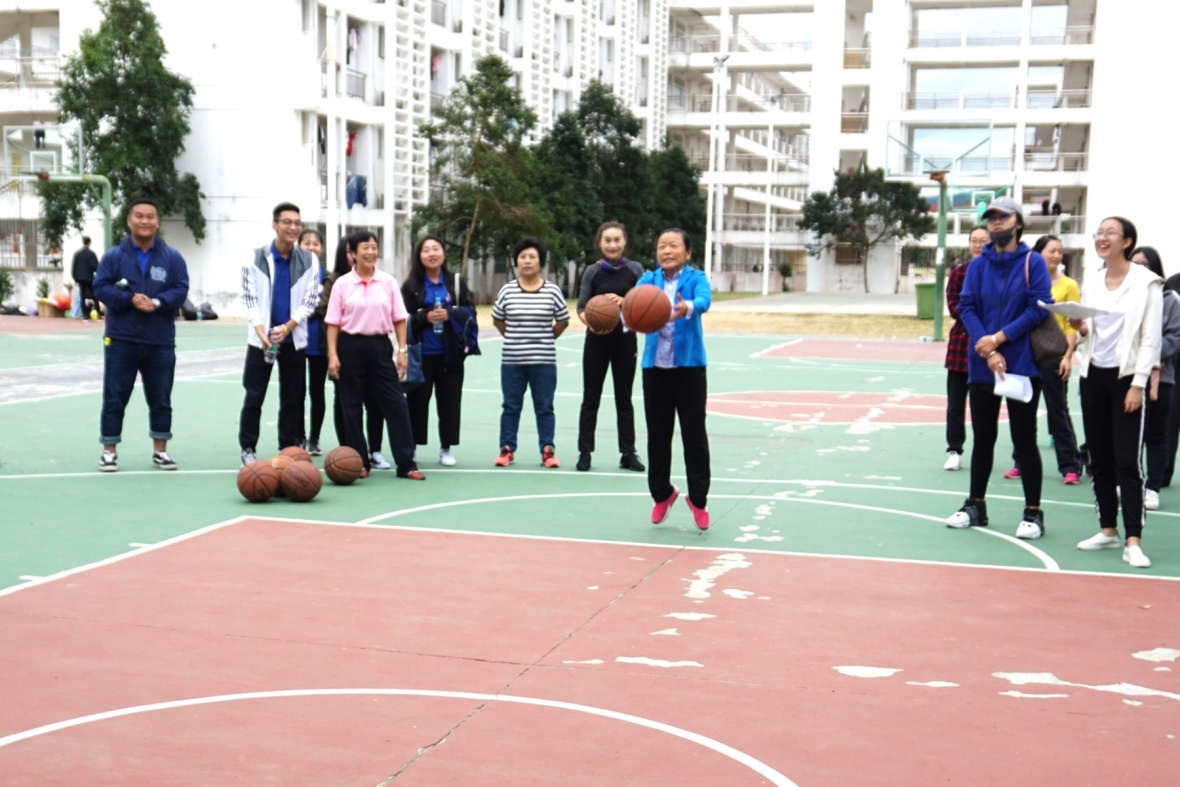 女子组选手站立于罚球线,每名选手轮流投篮,按投入篮圈次数多少决定名次。在比赛过程中,参赛老师们一个个精准的进球赢得了观众的阵阵叫好声。每个教师都使出了浑身解数,每一次投入篮筐时都面露微笑,似乎是对自己的充满自信。每次老师们的进球都能引起围观同学老师们的阵阵叫好声。经过紧张而激烈的角逐,夏金玉老师最终以投入4个球的成绩获得了第三名的好成绩。