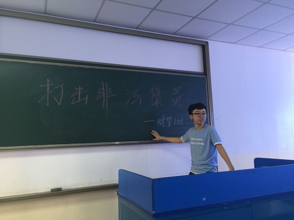 在此次主题班会中,班长认真地向同学们讲解了合法融资和非法集资的区别。通过一系列生动的例子强调了非法集资的危害,提醒同学们要自觉抵制远离非法集资,对“高额回报”“一夜暴富”的事情一定要擦亮眼睛,提高警惕,不要上当受骗。