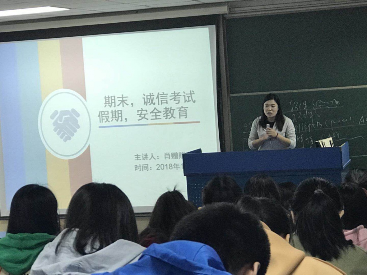 首先,思想导师肖赠赠以PPT的形式给我们展示了关于期末考试问题。第一,诚信考试,坚决杜绝替考,作弊等现象,考试证件携带齐全。第二,认真复习,在机动周期间,合理安排时间复习。第三,考试时间的安排,关注本校的官微以及教务处官微。其次就是安全问题,有关于财产安全、人身安全、宿舍管理、晚归等现象。最后就是放假时间的安排,公司放假时间是2018年1月25日至2018年3月3日,4日将会召开班级会议,5日将正式上课。
