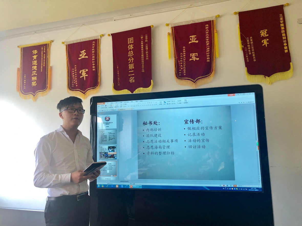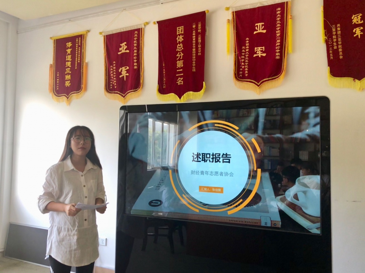之后,青协的副理事长周元波进行述职报告。周同学表示,在上学期中,必一运动共进行了154次志愿者活动,其中校外活动41次,校内则有113次。如此多的活动,足以看出财院学子的奉献精神。此外,周同学也简要阐述了上学期青协秘书处与宣传部的任务和职责。最后,周同学指出,在本学期,青协将开展盲人电影、梦想认领等更加丰富多彩的活动,以增进各组织之间,员工之间的友谊。