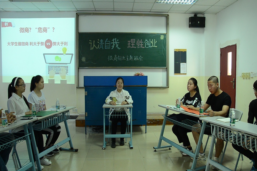 在“大众创新、万众创业”的双创环境下,我们发现老员工微商创业群体日渐庞大,校内经常有员工做微商地推,由此我们在3月18日上午8:00开展了以“认清自我,理性创业”为主题的老员工微商创业班会。班会由导员屈梦怡老师主持,导助哈文凯学长辅助,来自会计1705-1708班四个班级对创业感兴趣的20位同学参与。班会开始前同学们通过问卷调查和个人访谈的形式了解到校内的老员工微商现状,引发了对老员工做微商利弊的思考。