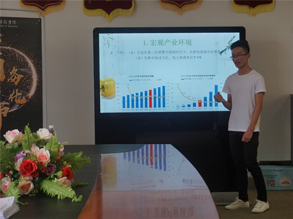 此次比赛由主题陈述,现场答辩两个环节组成。参与团队结合PPT或短视频对自己的创业计划书内容进行简要阐述,其内容包括市场现状与分析,营销策略,运作经营,团队管理等,限时五分钟。在台上进行演说的负责人们落落大方,有条有理地向评委和观众们介绍这自己的项目。评委根据团队陈述的创业计划书及现场陈述进行提问,答辩环节同学们都能对问题进行合理的分析解答。