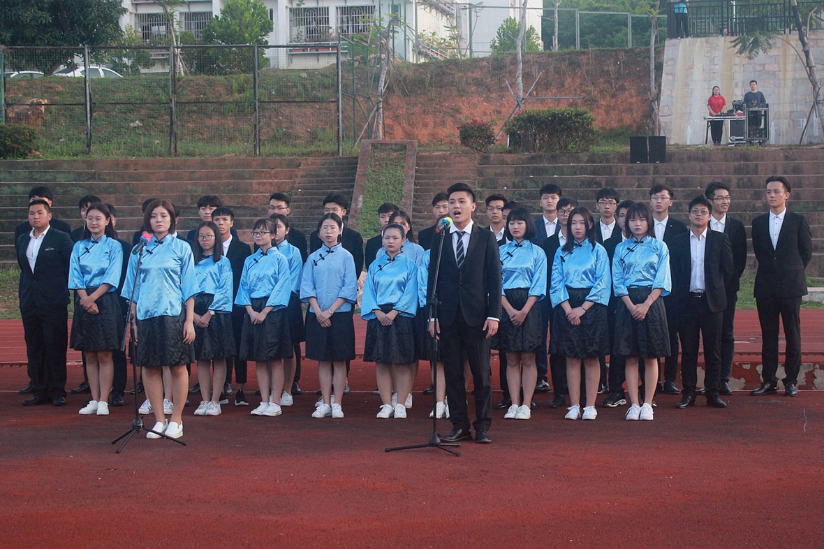 大会首先进行第一项:升国旗 奏国歌。伴着国歌响起,升旗手振臂一挥,老师和同学们肃然起敬,行着注目礼,看五星红旗在激昂的音乐声中缓缓上升。接下来,由员工代表管理公司的杨璐璐同学及教师代表体育公司党总书记依次做国旗下讲话,他们二位的讲话表达了对三院青年人的期望,以及在在新时代背景下,发挥我们老员工的积极作用,成为时代的有为青年。大会第四项,在音乐公司管弦乐队和合唱团的带领下,大家一起热情澎湃地齐声合唱《歌唱祖国》,“五星红旗迎风飘扬,胜利歌声多么响亮,歌唱我们亲爱的祖国,从今走向繁荣富强...”动人嘹亮的歌声洋溢了整个操场,展现了bsports必一登录入口这群青年学子的活力。最后,全场庄重宣誓:坚定信念,立鸿鹄志,求真问学,勇当尖兵,祝福我们伟大祖国繁荣昌盛。