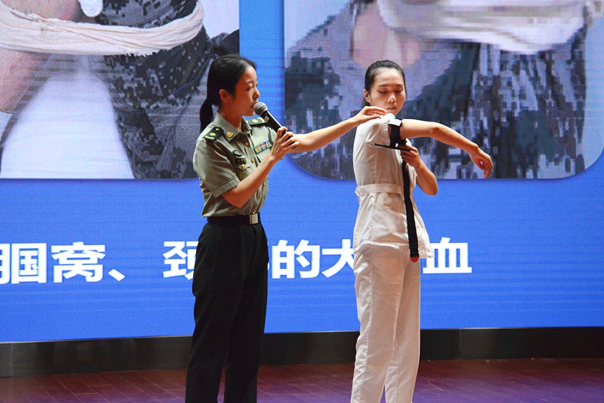 接着,褚医生通过幻灯片的介绍,将如何快速止血的方法一一介绍给大家,她在台上与护士演示静动脉出血要怎样缠绷带才能够更快止血,使同学们加深了对急救措施的印象。之后,褚医生还向同学们讲解了食物中毒发生的症状和不同种类食物混搭在一起有可能引发中毒的现象。