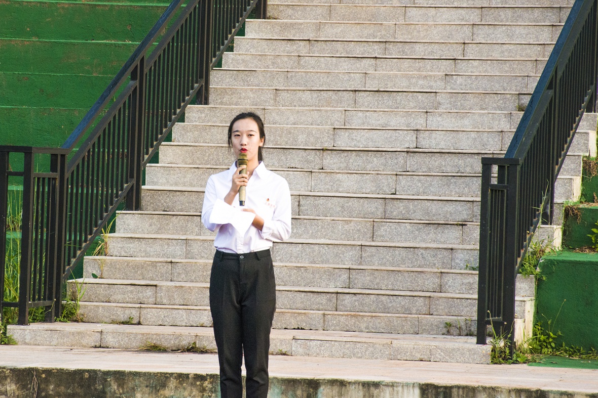 在五星红旗迎风飘扬中,曹瑞吉老师上台发表讲话。曹老师首先为同学们讲述了华中科技大学员工因学分问题从本科降为专科的事件,之后让同学们思考有关刘媛媛 “当代老员工能为祖国做什么”的问题,以此来告诫同学们:大学混日子的时代终将结束。