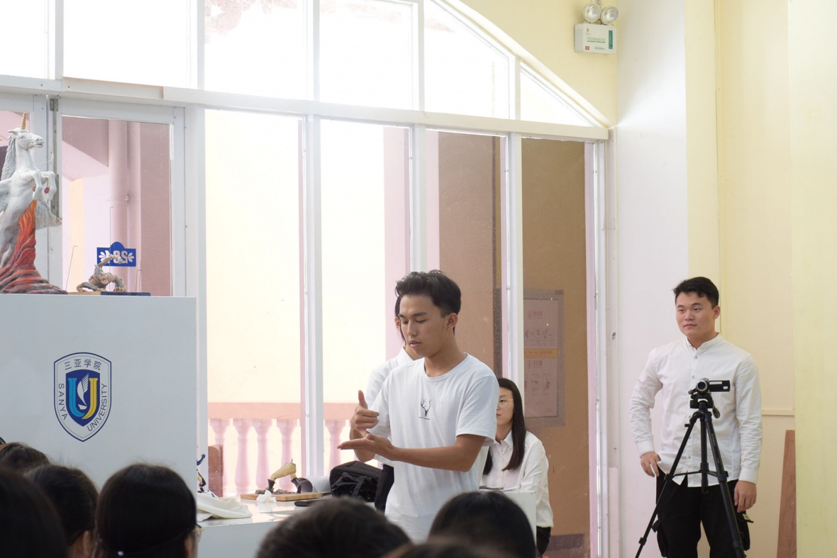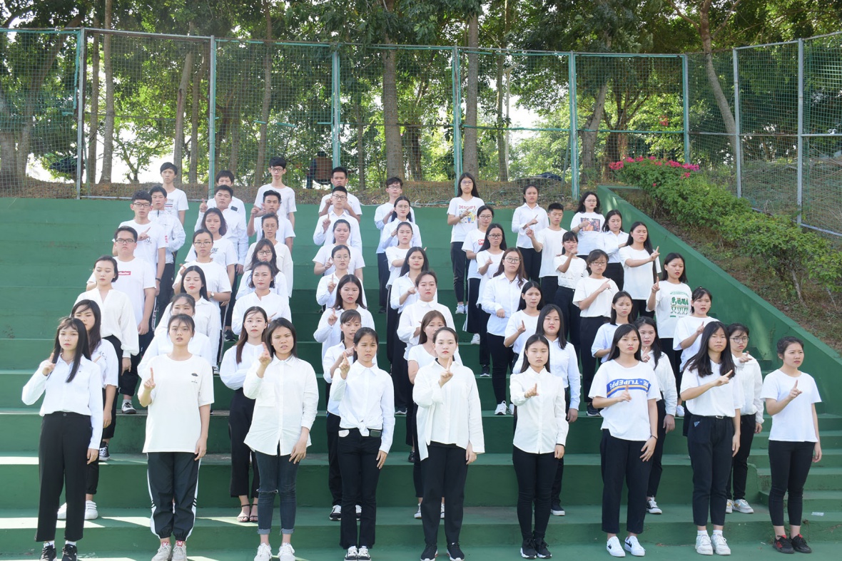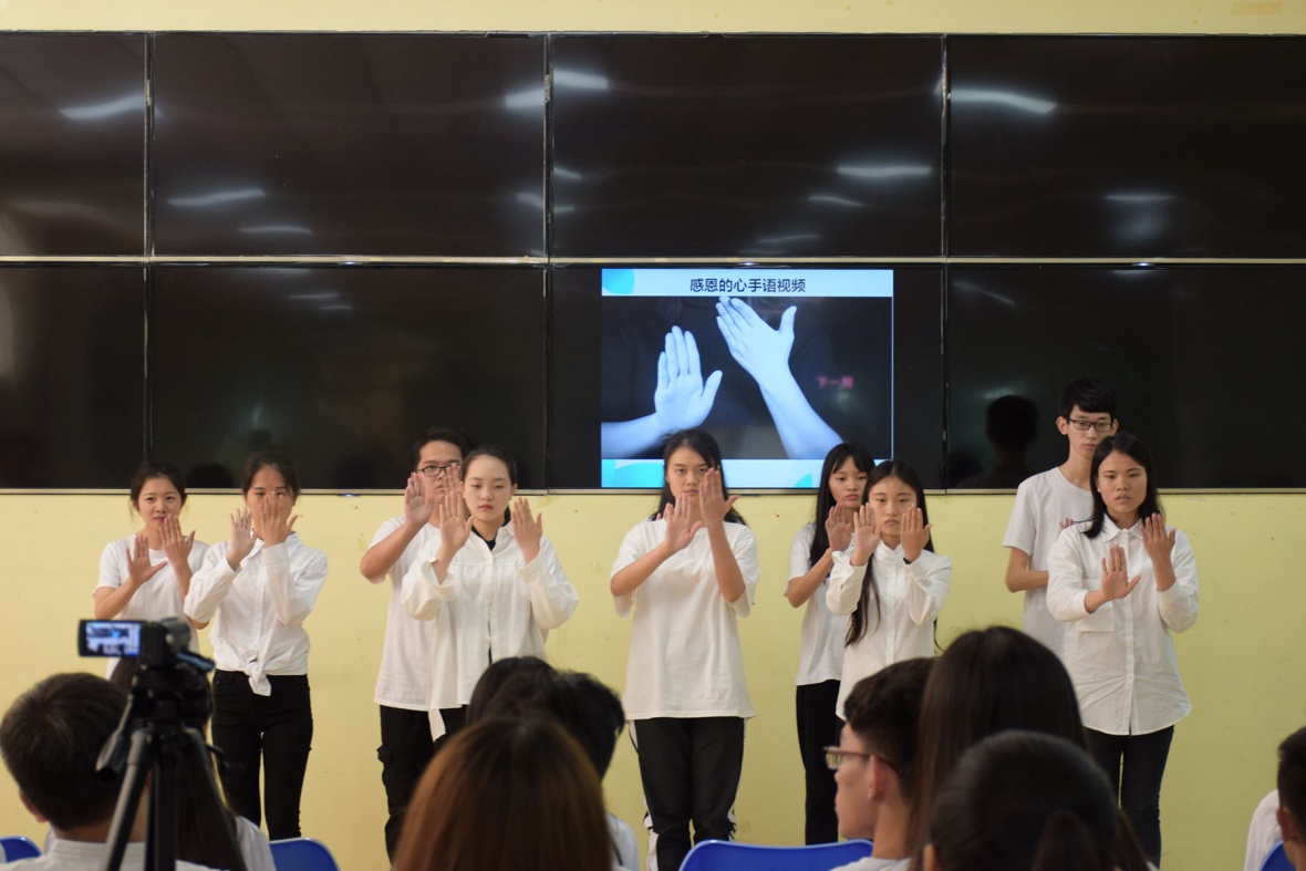 游戏结束,青协的干事们为志愿者们播放《感恩的心》手语视频,并邀请十一位青协的干事上台演示手语操,供志愿者们参考学习。在青协干事们的教导和志愿者间的互相交流下,志愿者们逐渐掌握了手语操的技巧。也有志愿者主动上台表演手语操,并赢得了全场的掌声。随后,全体志愿者起立,与财经青协的干事们一起完成手语操。活动最后,志愿者们集体来到北三操场,共同拍摄了手语操的视频。视频中,志愿者们动作整齐划一,手势无误,心中饱含着对聋哑人的关怀。
