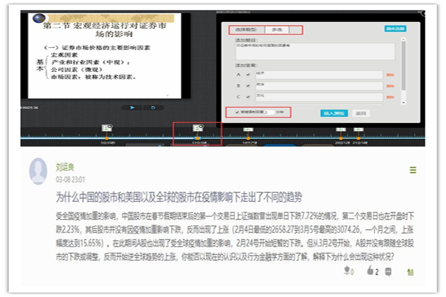 在理论知识讲授方面,主要通过学习通录制速课的方式进行,充分利用Microsoft power point的屏幕录制功能,提前录制基础知识的讲解视频,以方便同学们学习。同时,利用学习通的功能,在视频中插入相应的单选、多选或判断题,这些题的出现往往是在刚刚讲解完以后出现的,对刚刚讲过的理论知识进行考察,如果答错,就会强制回看,避免了刷课的可能。在课程的学习过程中,也会设置相应的与市场发展契合的题目,让同学积极思考,形成自己的见解。此外,通过学习通,对每名同学的学习情况进行监督,及时敦促未完成学习的同学及时完成。