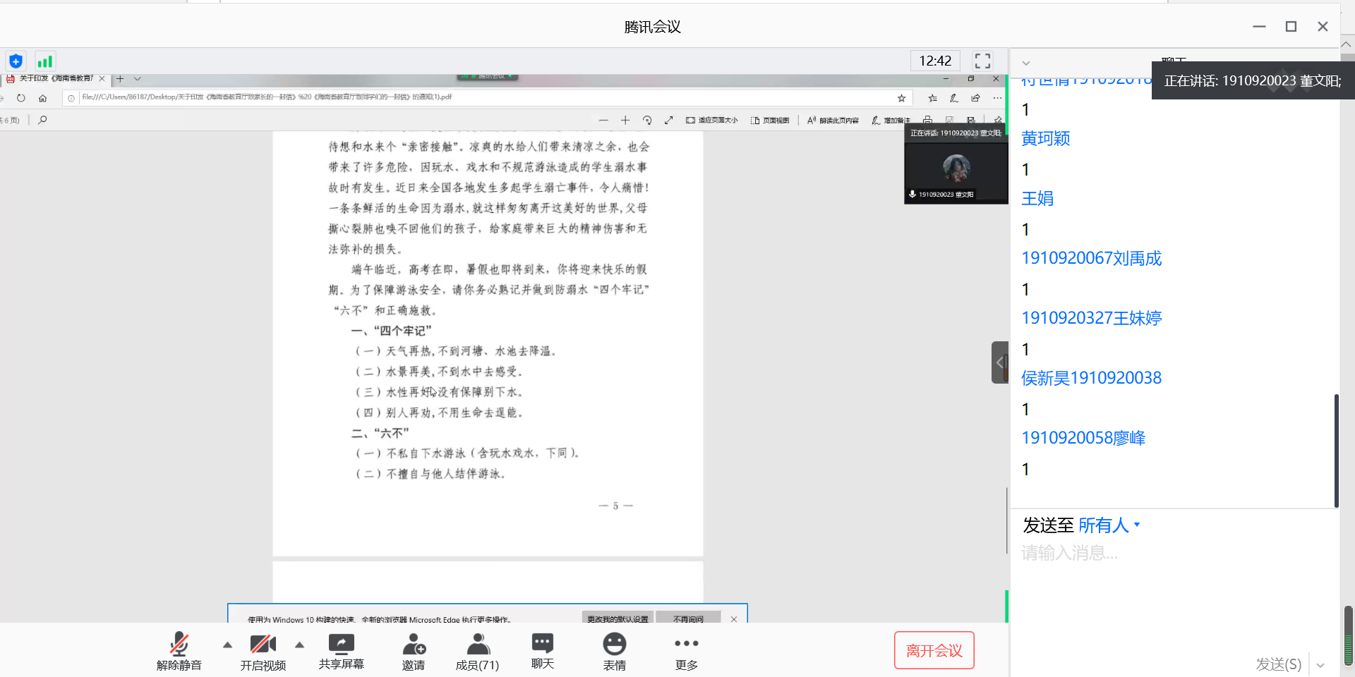为了扎实有效的开展防溺水安全教育工作,教育部门及公司广泛宣传防溺水知识,发布《海南省教育厅致家长的一封信》及《海南省教育厅致同学们的一封信》,严格要求每一位员工及家长认真阅读该文件内容,珍惜生命,远离危险水域。2020年6月25日下午15时,会计1903班由班长董文阳在腾讯会议app开展有关文件解读的主题班会。