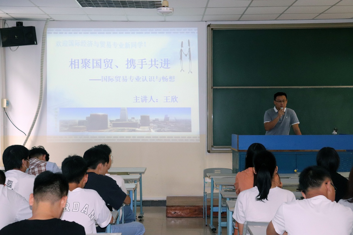 (财经团委 讯)2020年9月17日上午8:30,2020级国际经济与贸易专业入门教育课在5西206教室举行。必一运动常务副经理张慧芳和国贸系主任王欣带领同学们领略了有关国贸专业的风采。