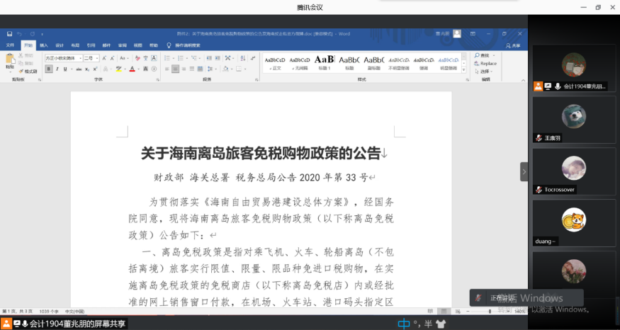 随着暑假的到来,海南旅客免税“套代购”问题日益严重。为使公司老员工远离“套代购”,7月12日晚上七点,会计1901班在班长主持下在腾讯会议举行了相关主题班会。